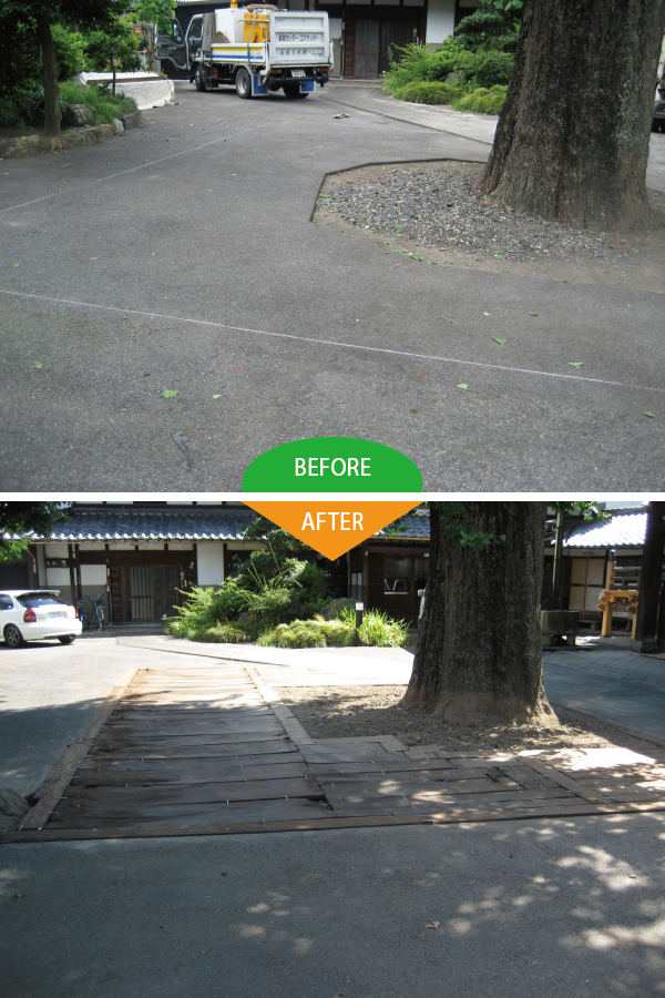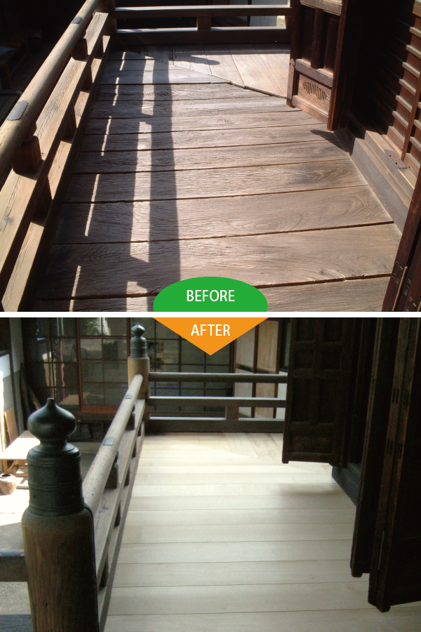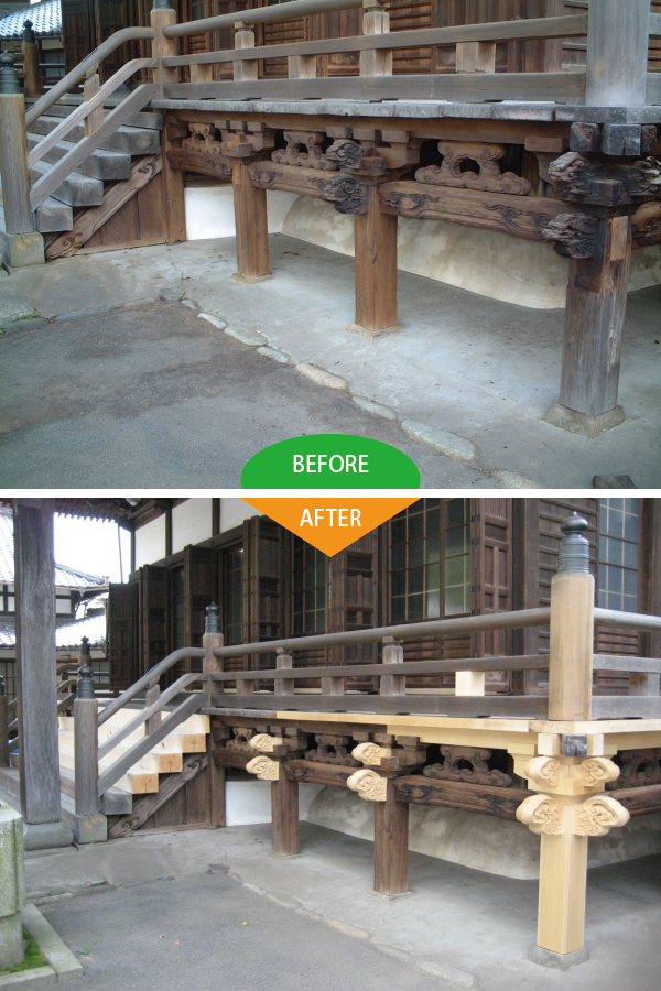 [改修工事を請けた経緯] 前々から高欄の修繕を考えておられましたが、なかなか着手することができずにいたところ住職の知人の紹介でお世話になることになりました。